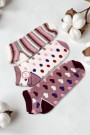 Set; 1 adet gri–pembe–bordo çizgili, 1 adet beyaz zemin üzerine çok renkli puantiyeli (pembe, gri, lacivert, bordo), 1 adet gül kurusu zemin üzerine kalp desenli (pembe/beyaz/lacivert/bordo) çoraptan oluşur. Krem–bordo kontrast burun–topuk detaylarıyla şirin ve modern bir görünüm sunar.