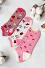 Set; 1 adet gül kurusu zemin üzerine büyük renkli kalpli, 1 adet krem zemin üzerine çok renkli kalpli ve 1 adet pembe zemin üzerine küçük kalp motifli çoraptan oluşur. Pembe/krem burun–topuk detayları şirin bir kontrast verir; okulda, evde ve günlük kombinlerde idealdir.