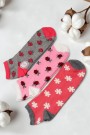 Set; 1 adet gri zemin üzerine pembe gül motifli, 1 adet pembe zemin üzerine kırmızı uğur böcekli ve 1 adet somon/koral zemin üzerine beyaz papatyalı çoraptan oluşur. Kontrast burun–topuk (gri, pembe, krem) detaylarıyla şirin ve enerjik bir görünüm sunar.